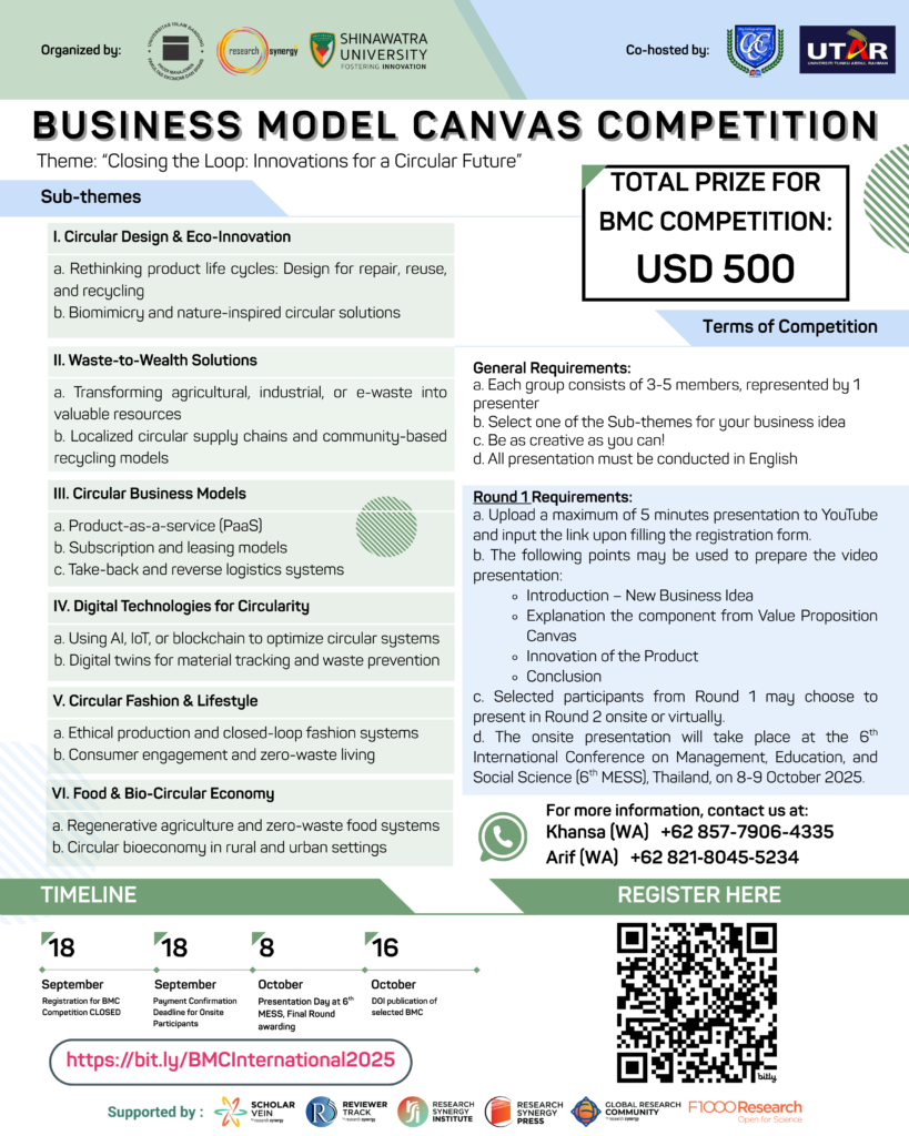 The 6th International Conference on Management, Education, and Social Science (6th MESS), organized by Research Synergy Foundation, Management Study Program, Faculty of Economics and Business, Universitas Islam Bandung, and Shinawatra University, Co-hosted by City College of Calamba, supported by Scholarvein, Reviewer Track, Research Synergy Institute, Research Synergy Press, Global Research Community, and F1000Research.