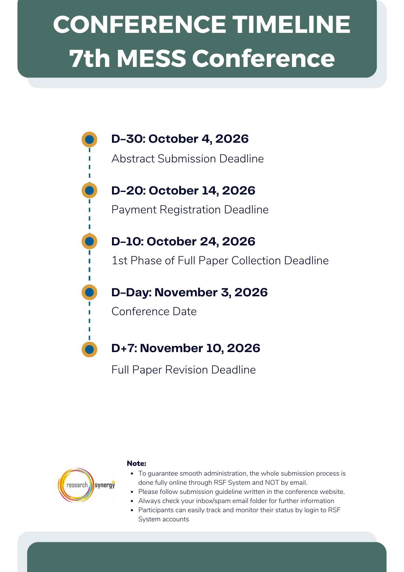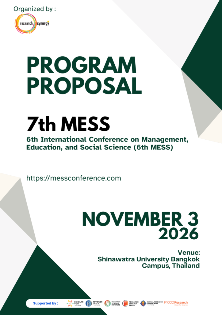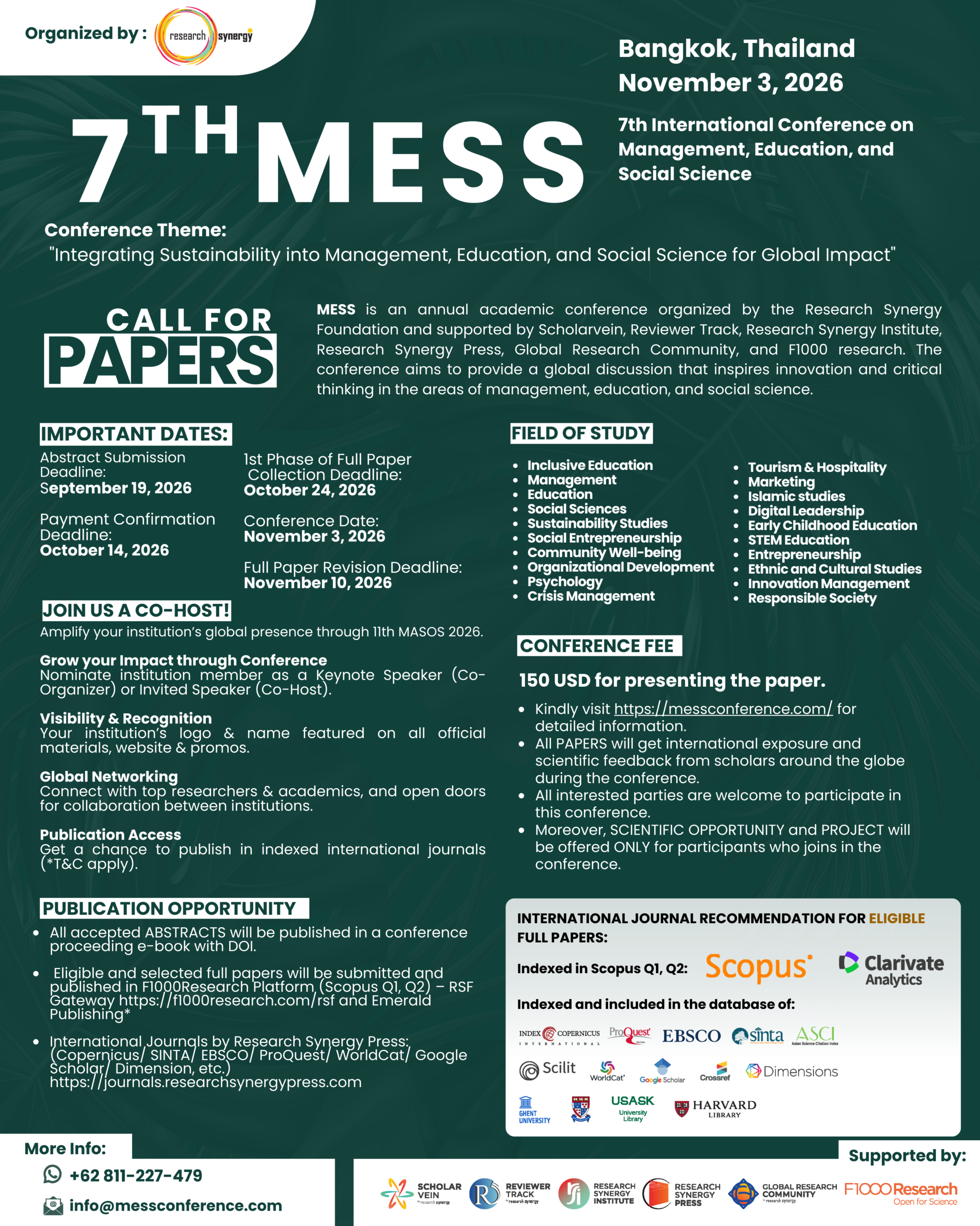 The 7th International Conference on Management, Education, and Social Science (7th MESS), organized by Research Synergy Foundation, supported by Scholarvein, Reviewer Track, Research Synergy Institute, Research Synergy Press, Global Research Community, and F1000Research.